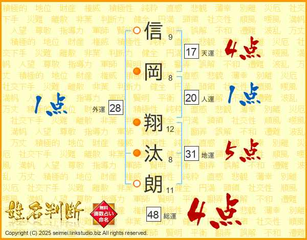 信(9画)岡(8画) 翔(12画)汰(8画)朗(11画)