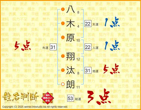 八(8画)木(4画)原(10画) 翔(12画)汰(8画)朗(11画)