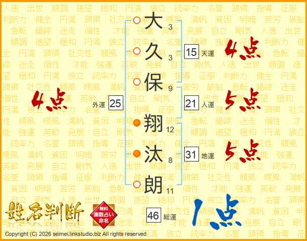 大(3画)久(3画)保(9画) 翔(12画)汰(8画)朗(11画)