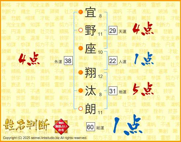 宜(8画)野(11画)座(10画) 翔(12画)汰(8画)朗(11画)