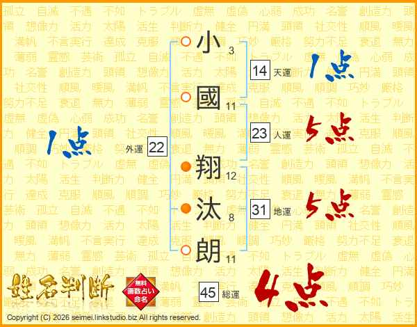 小(3画)國(11画) 翔(12画)汰(8画)朗(11画)