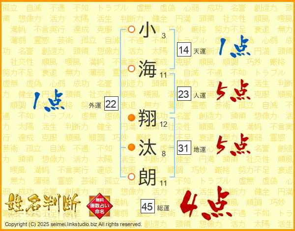 小(3画)海(11画) 翔(12画)汰(8画)朗(11画)