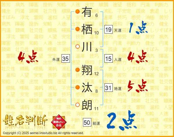有(6画)栖(10画)川(3画) 翔(12画)汰(8画)朗(11画)