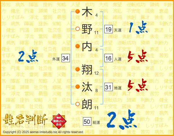 木(4画)野(11画)内(4画) 翔(12画)汰(8画)朗(11画)