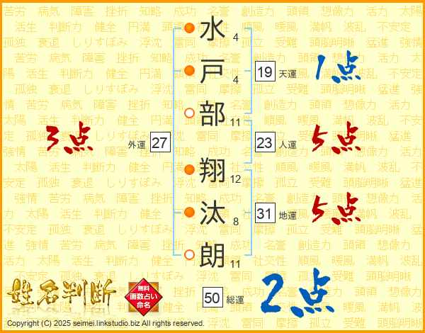 水(4画)戸(4画)部(11画) 翔(12画)汰(8画)朗(11画)