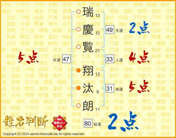 瑞(13画)慶(15画)覧(21画) 翔(12画)汰(8画)朗(11画)