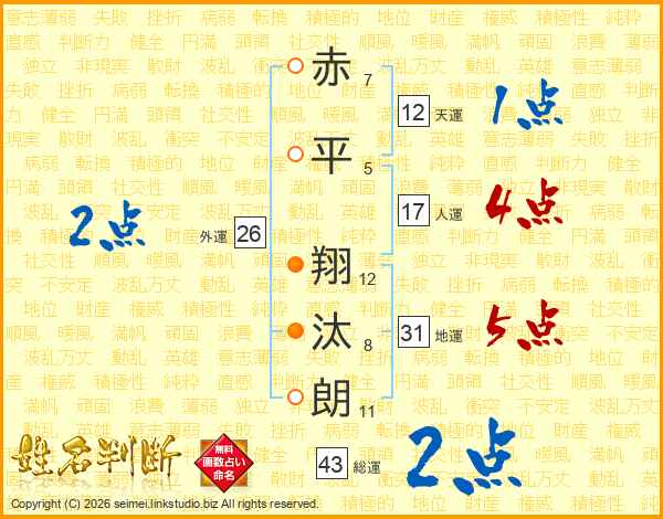 赤(7画)平(5画) 翔(12画)汰(8画)朗(11画)