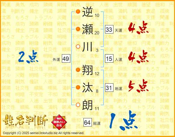 逆瀬川翔汰朗さんの天運は33画の4点!