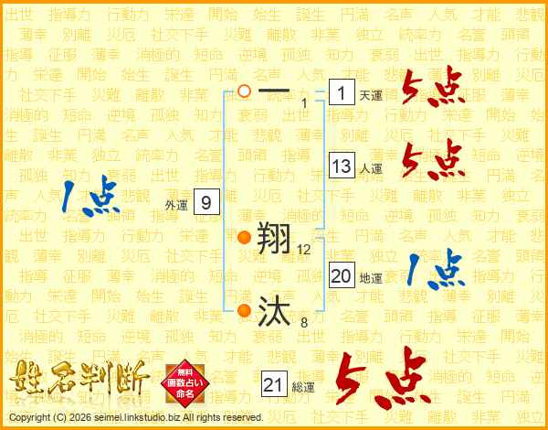 一翔汰さんの総運は21画の5点!