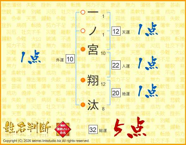一(1画)ノ(1画)宮(10画) 翔(12画)汰(8画)