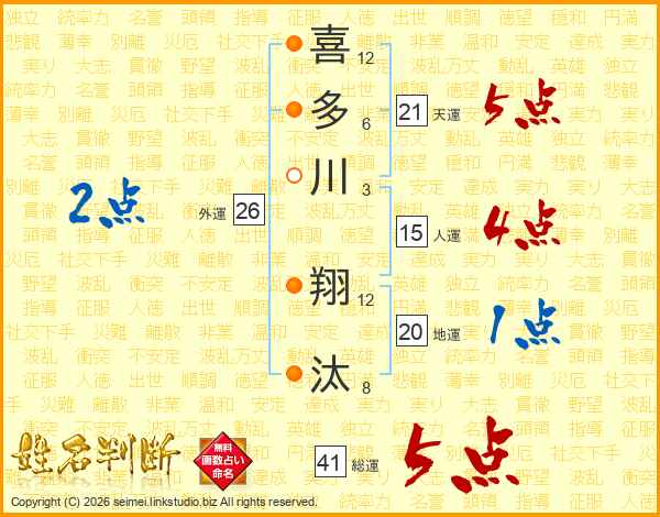 喜(12画)多(6画)川(3画) 翔(12画)汰(8画)