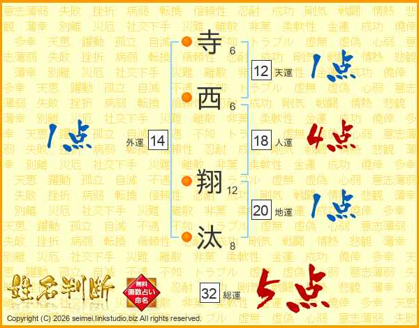 寺(6画)西(6画) 翔(12画)汰(8画)