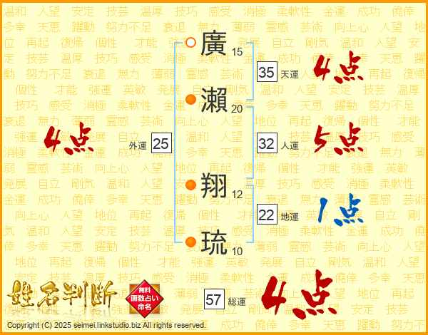 廣(15画)瀨(20画) 翔(12画)琉(10画)