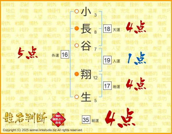 小(3画)長(8画)谷(7画) 翔(12画)生(5画)