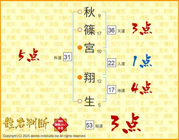 秋(9画)篠(17画)宮(10画) 翔(12画)生(5画)