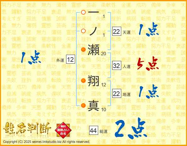 一(1画)ノ(1画)瀬(20画) 翔(12画)真(10画)