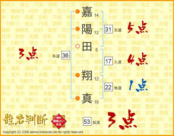 嘉(14画)陽(12画)田(5画) 翔(12画)真(10画)