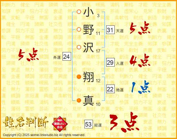 小(3画)野(11画)沢(17画) 翔(12画)真(10画)