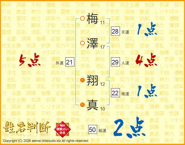 梅(11画)澤(17画) 翔(12画)真(10画)