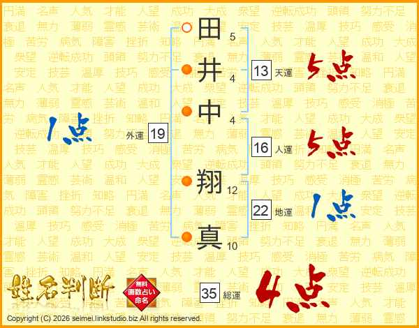 田(5画)井(4画)中(4画) 翔(12画)真(10画)