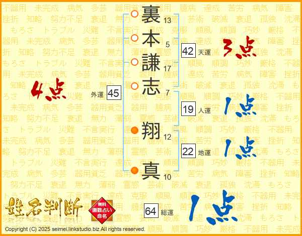 裏(13画)本(5画)謙(17画)志(7画) 翔(12画)真(10画)