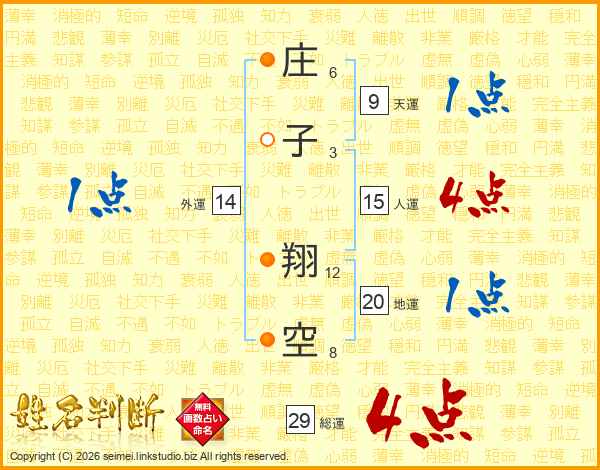 生活面を象徴する運勢です。外部から受ける影響力を表し、結婚運、家庭運や職場、環境への順応性を表します。総運から人運を引いた画数。姓や名が1文字の場合を除く。