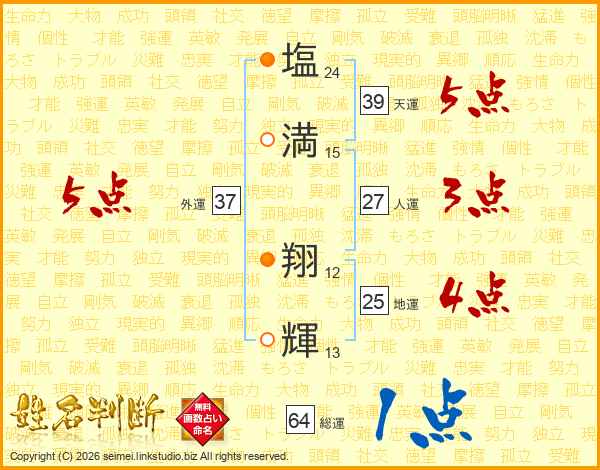 塩(24画)満(15画) 翔(12画)輝(13画)