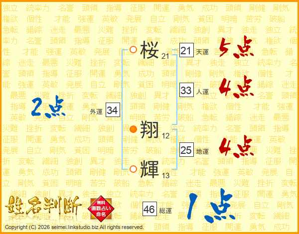 生活面を象徴する運勢です。外部から受ける影響力を表し、結婚運、家庭運や職場、環境への順応性を表します。総運から人運を引いた画数。姓や名が1文字の場合を除く。