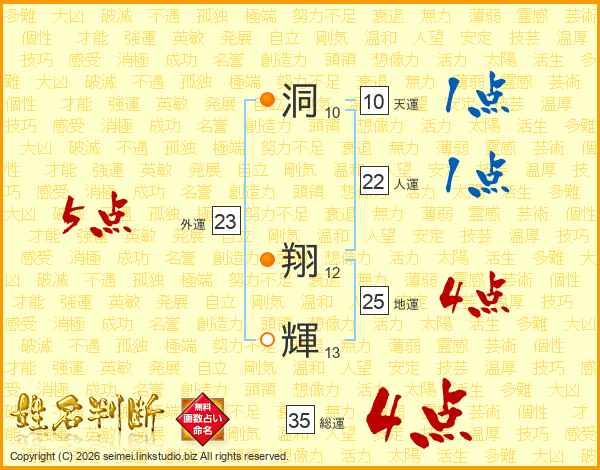 あなたの人生を表す1番重要な運勢です。生涯を通じて影響する総合運となり、主に50歳以降の晩年期に影響を及ぼします。苗字と名前の合計画数。