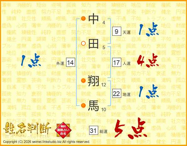 生活面を象徴する運勢です。外部から受ける影響力を表し、結婚運、家庭運や職場、環境への順応性を表します。総運から人運を引いた画数。姓や名が1文字の場合を除く。