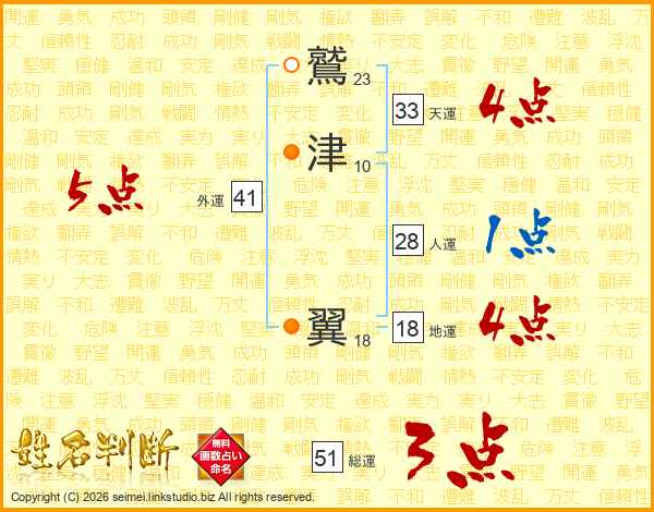 生活面を象徴する運勢です。外部から受ける影響力を表し、結婚運、家庭運や職場、環境への順応性を表します。総運から人運を引いた画数。姓や名が1文字の場合を除く。