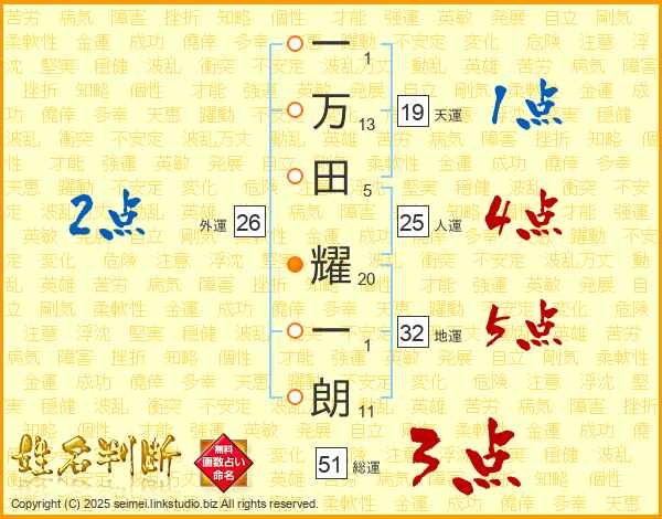 一(1画)万(13画)田(5画) 耀(20画)一(1画)朗(11画)