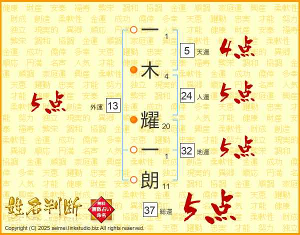 一(1画)木(4画) 耀(20画)一(1画)朗(11画)