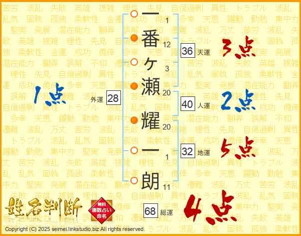 一番ヶ瀬耀一朗さんの地運は32画の5点!