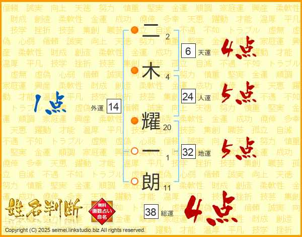 二(2画)木(4画) 耀(20画)一(1画)朗(11画)