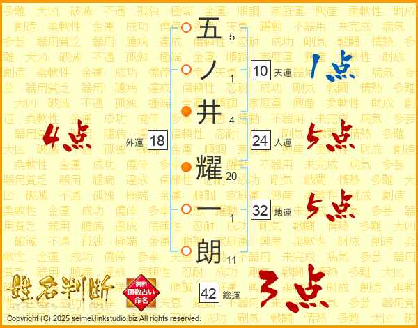 五ノ井耀一朗さんの外運は18画の4点!