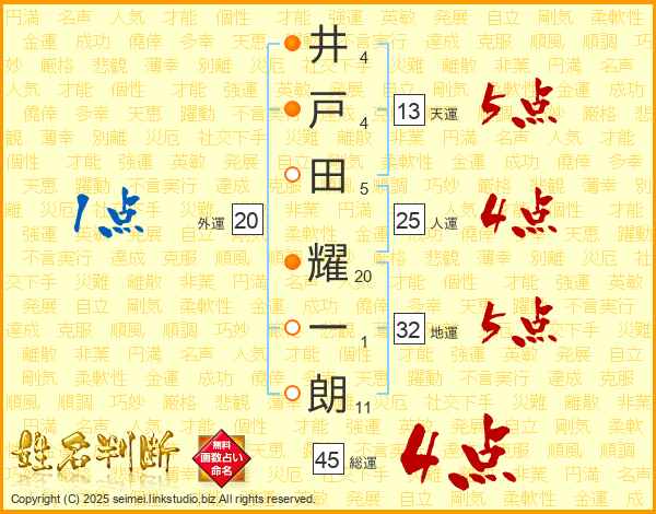 井(4画)戸(4画)田(5画) 耀(20画)一(1画)朗(11画)