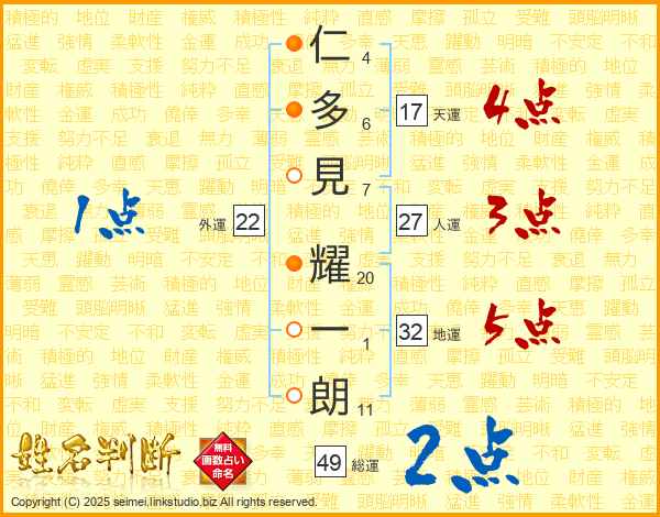仁(4画)多(6画)見(7画) 耀(20画)一(1画)朗(11画)