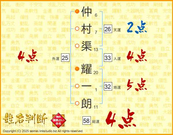 仲(6画)村(7画)渠(13画) 耀(20画)一(1画)朗(11画)
