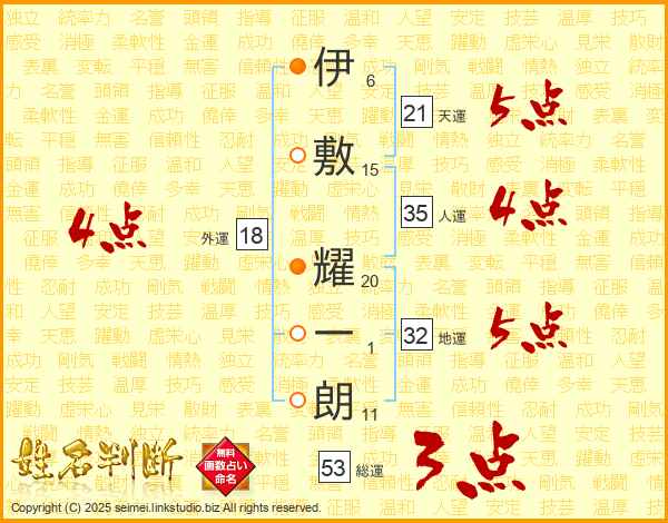伊(6画)敷(15画) 耀(20画)一(1画)朗(11画)