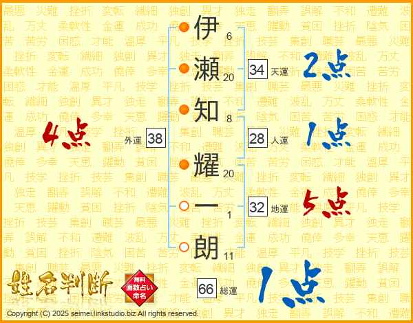 伊(6画)瀬(20画)知(8画) 耀(20画)一(1画)朗(11画)