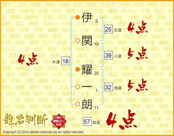 伊(6画)関(19画) 耀(20画)一(1画)朗(11画)