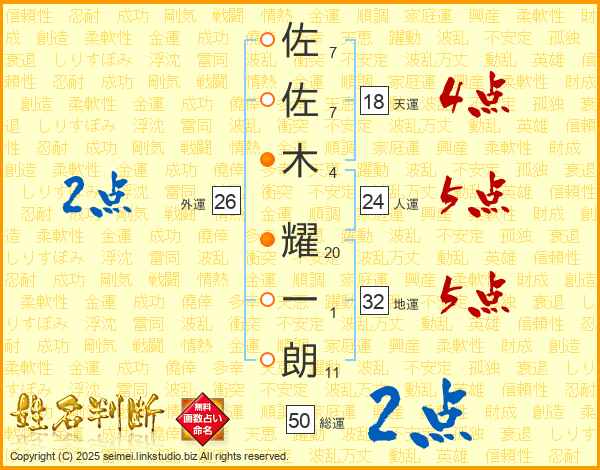 佐(7画)佐(7画)木(4画) 耀(20画)一(1画)朗(11画)