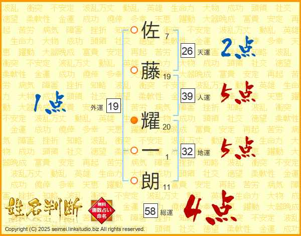 佐(7画)藤(19画) 耀(20画)一(1画)朗(11画)