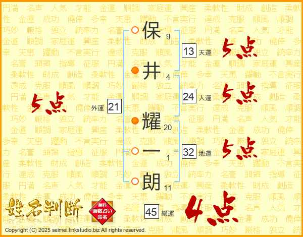 保(9画)井(4画) 耀(20画)一(1画)朗(11画)