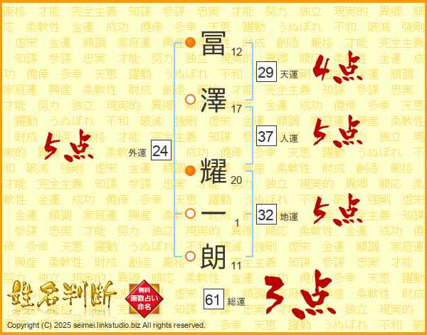 冨(12画)澤(17画) 耀(20画)一(1画)朗(11画)