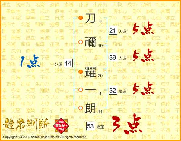 刀禰耀一朗さんの総運は53画の3点!