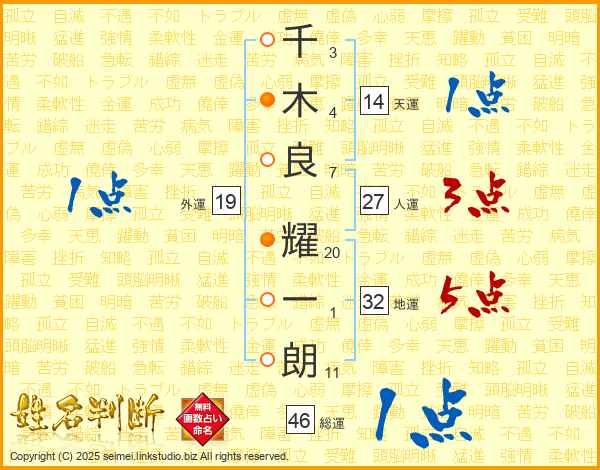 千(3画)木(4画)良(7画) 耀(20画)一(1画)朗(11画)
