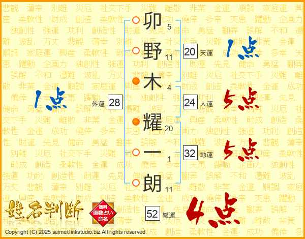 卯野木耀一朗さんの総運は52画の4点!