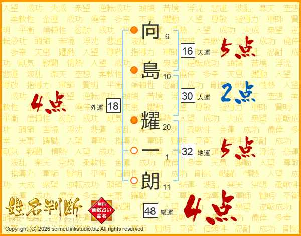 向(6画)島(10画) 耀(20画)一(1画)朗(11画)